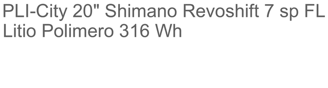 El modelo Egarbike PLI-City es uno de los modelos plegables del mercado más completos, todos sus componetes están pensados al detalle, se presenta como la nueva evolución de la bicicleta eléctrica plegable para uso en ciudad y vías verdes ,es potente elegante y confortable. Incorpora de serie frenos de disco, como novedad una horquilla rígida hidráulica, sistema de gestion LCD con velocímetro, batería interna de Litio Polimero - permitiendo autonomías que rondan los 40-50kilómetros, permite que el motor ( un BP top en su categoría) funcione a toda velocidad, incluso cuesta arriba. Sus ruedas de 20 pulgadas proporcionan una tracción en subida inmejorable. Recomendada para desplazamientos diarios en ciudad y paseos .